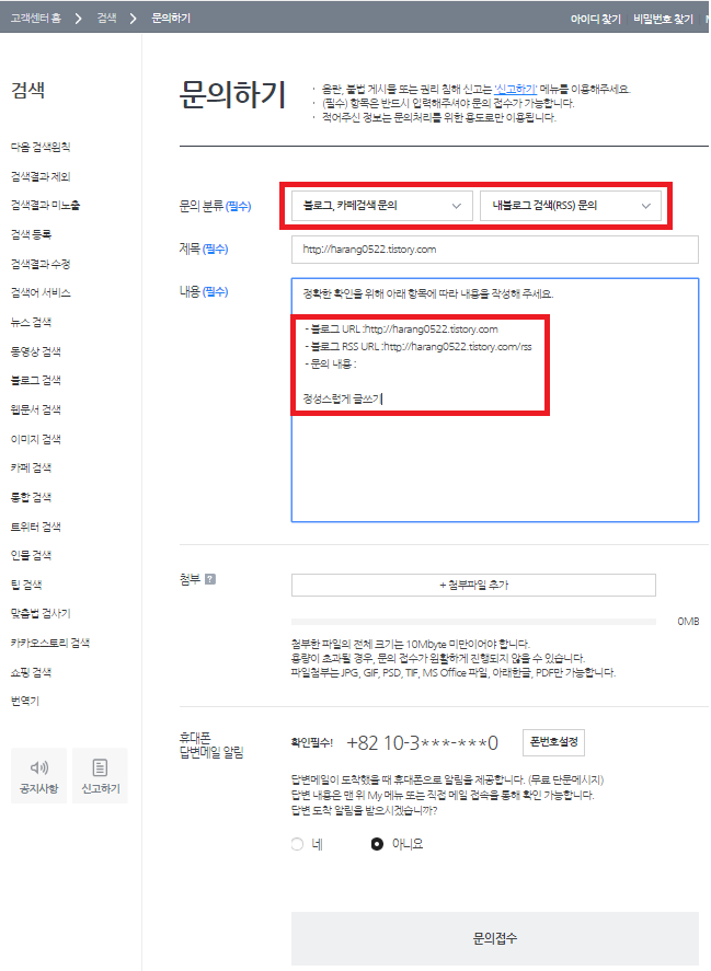 1. 다음 - 고객센터 클릭 2. 검색 - 검색결과 미노출 클릭 3. 원하는 블로그가 검색결과에 나오지 않아요. - 문의하기 바로가기 클릭 4. 정성스럽게 글을 쓴후(^^) 문의접수