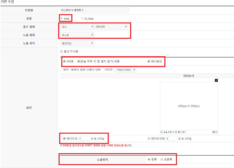 아래 그림과 같이 유형에 Web, 광고형태및 사이즈는 원하는 형태로 해도 되겠다.