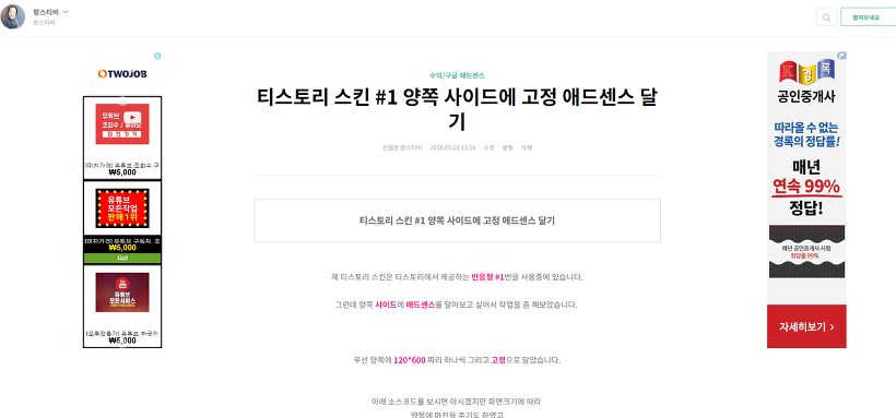 그런데 양쪽 사이드에 애드센스를 달아보고 싶어서 작업을 좀 해보았습니다.