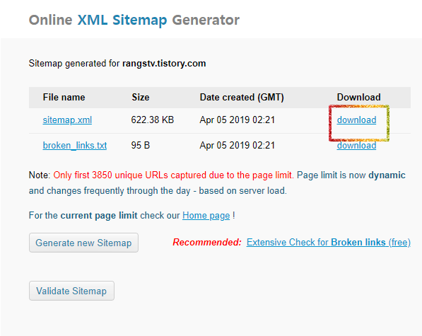 4. 시간이 지나면 아래 하단부에 Please Download your Sitemap 을 클릭하여 sitemap.xml 을 다운로드 합니다.